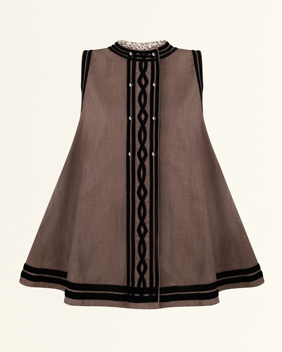 Особлива тканина шоколадного кольору із кропиви та льону є екологічною, довговічною та комфортною навіть на спекотне літо. Підкладка кольорова уквітчана, склад 60% віскоза та 40% бавовна.