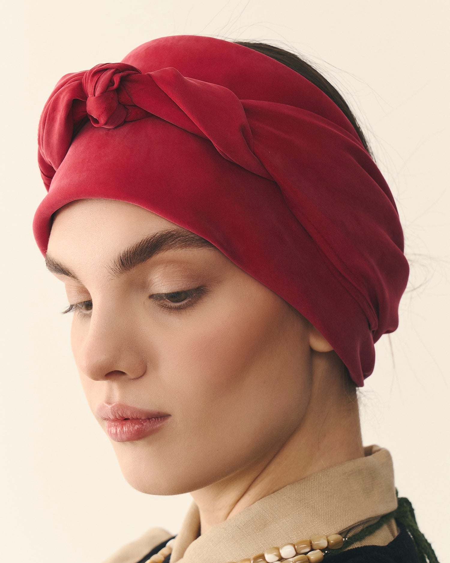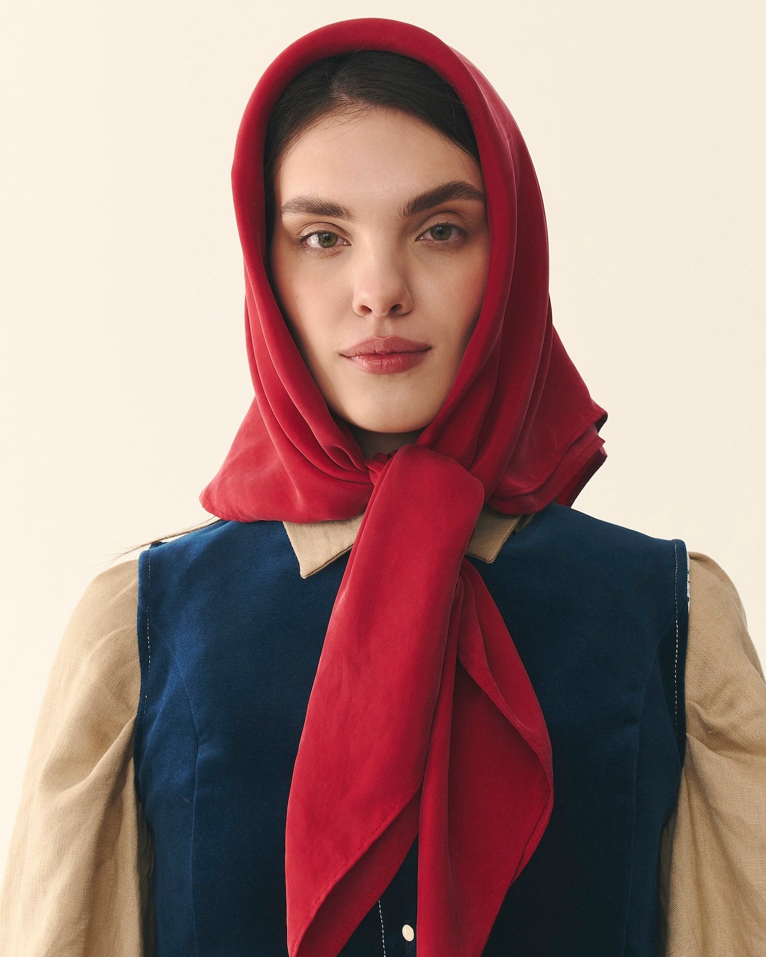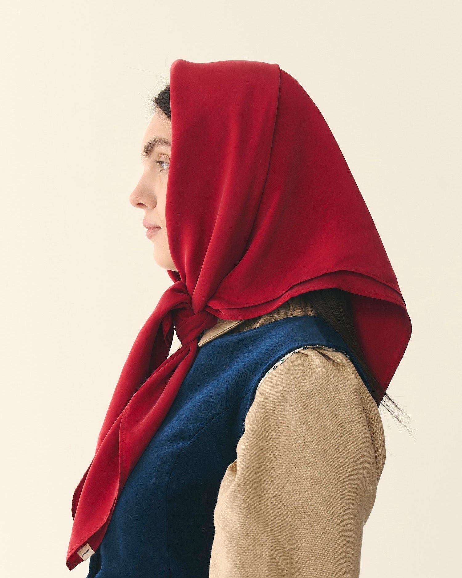Шовкова хустинка з додаванням целюлози евкаліпту чарівно переливається на сонці та матова у тіні. Легка, приємна на дотик і надзвичайно ніжна за текстурою. Глибокий темно-червоний колір та легкий відблиск ще більше наближає її до автентичного взірця.