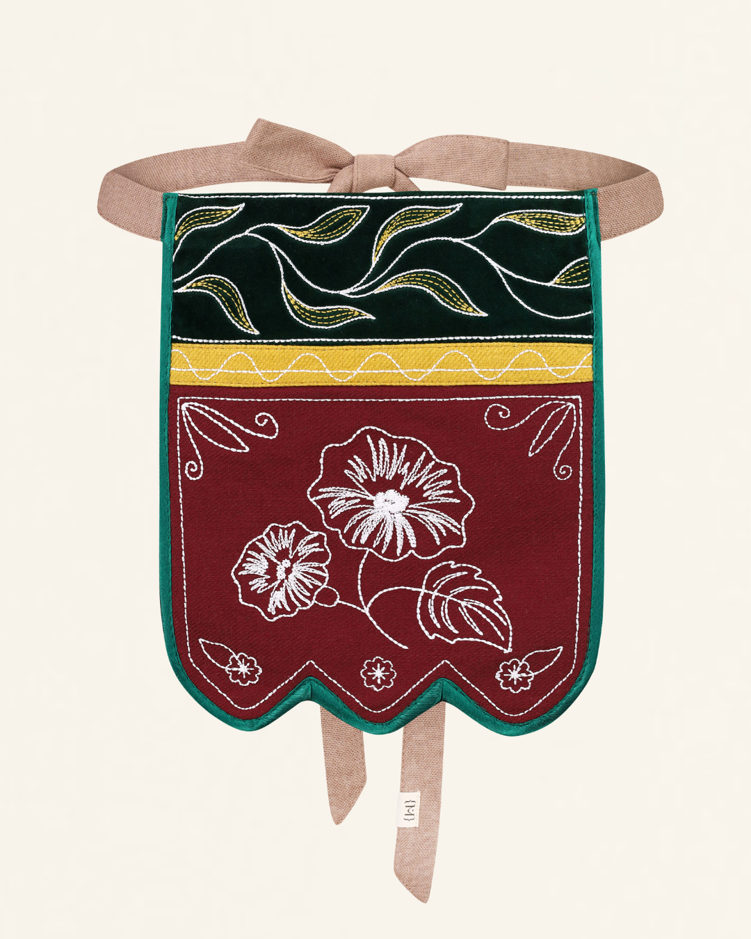 Кишенька "Мальва" - безумовно прикує погляди і стане головним святковим акцентом будь-то сучасного образу чи колоритного строю. Дуже вмістка, з унікальним краєм у вигляді зубчиків по низу - форма, що особливо часто зустрічалася в першій половині ХХ ст. у краях Полтавщини, Решетилівського р-н. Ладунка обʼєднала розмаїті текстури, які дуже приємні на дотик: гладенький атласний край, мʼяка оксамитова зелена деталь зверху і рельʼєфний бурячковий льон.