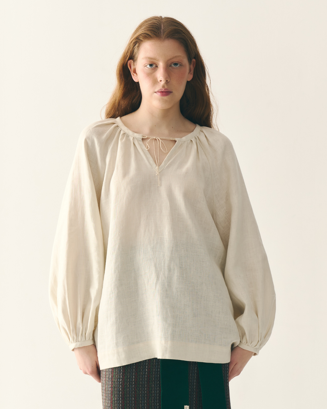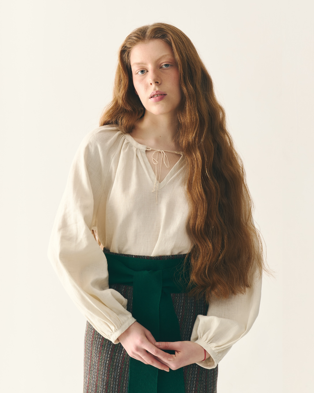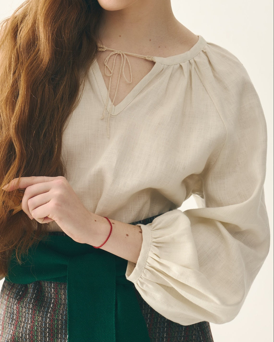 Вільна в обʼємі, з пишними рукавами, зібрана у рясні складочки. На манжетах гудзички, біля горловини шнурівка. Петельки вивʼязані вручну з бавовняної нитки. У комплекті мішечок зі змінними кольоровими стрічками для горловини (також присутні блакитно-жовті стрічки).