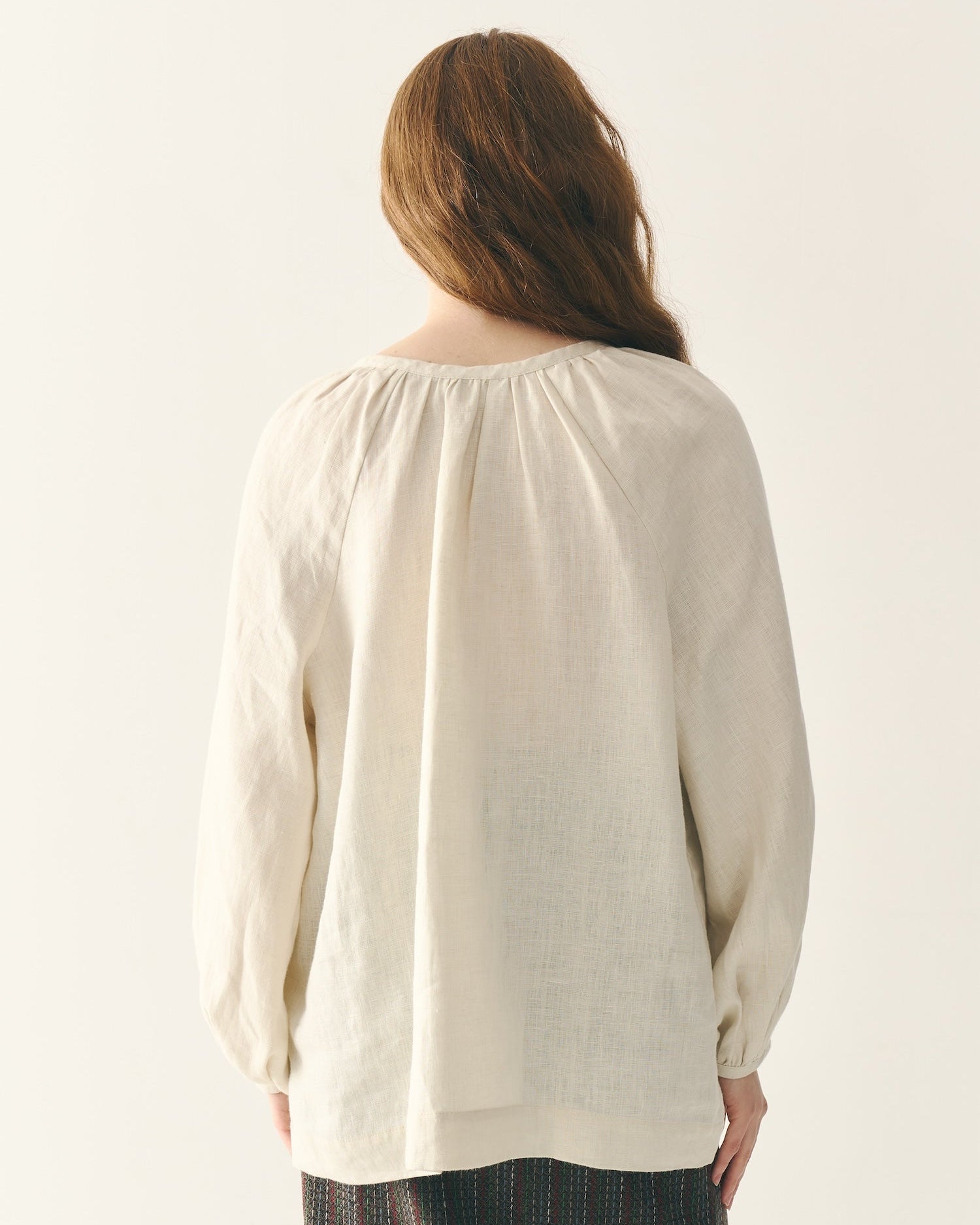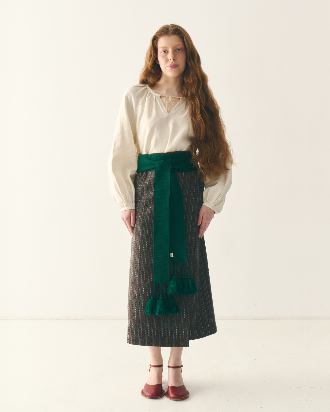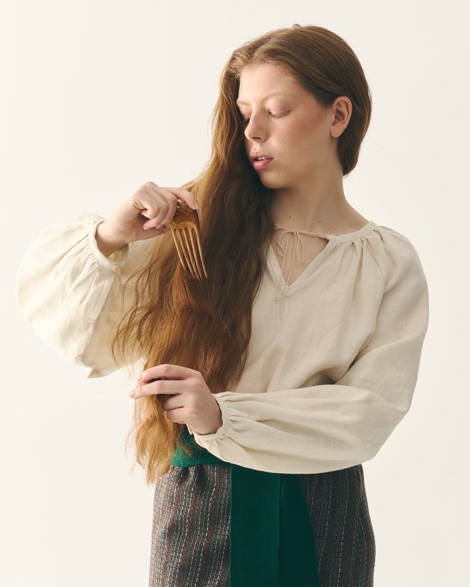 Вільна в обʼємі, з пишними рукавами, зібрана у рясні складочки. На манжетах гудзички, біля горловини шнурівка. Петельки вивʼязані вручну з бавовняної нитки. У комплекті мішечок зі змінними кольоровими стрічками для горловини (також присутні блакитно-жовті стрічки).