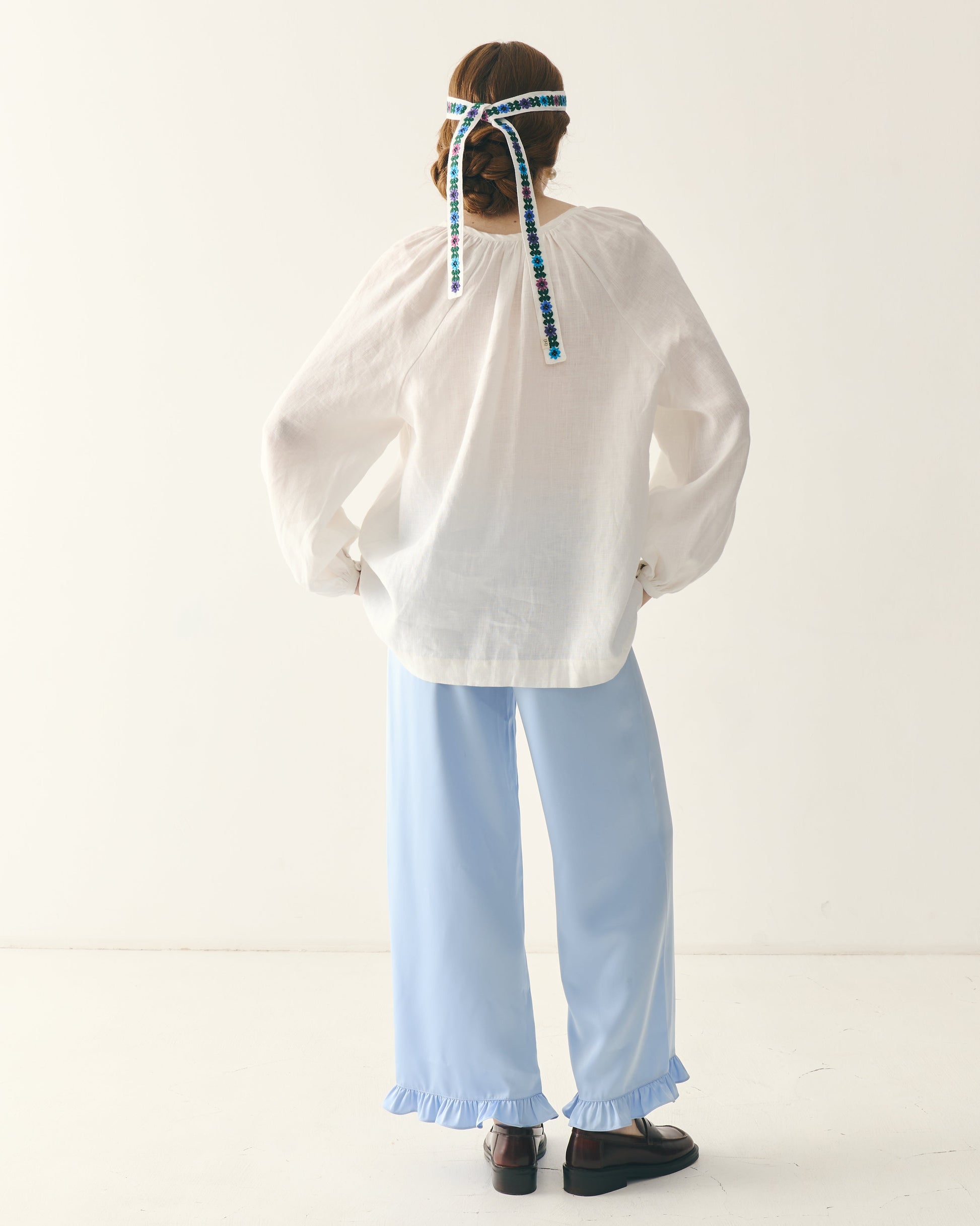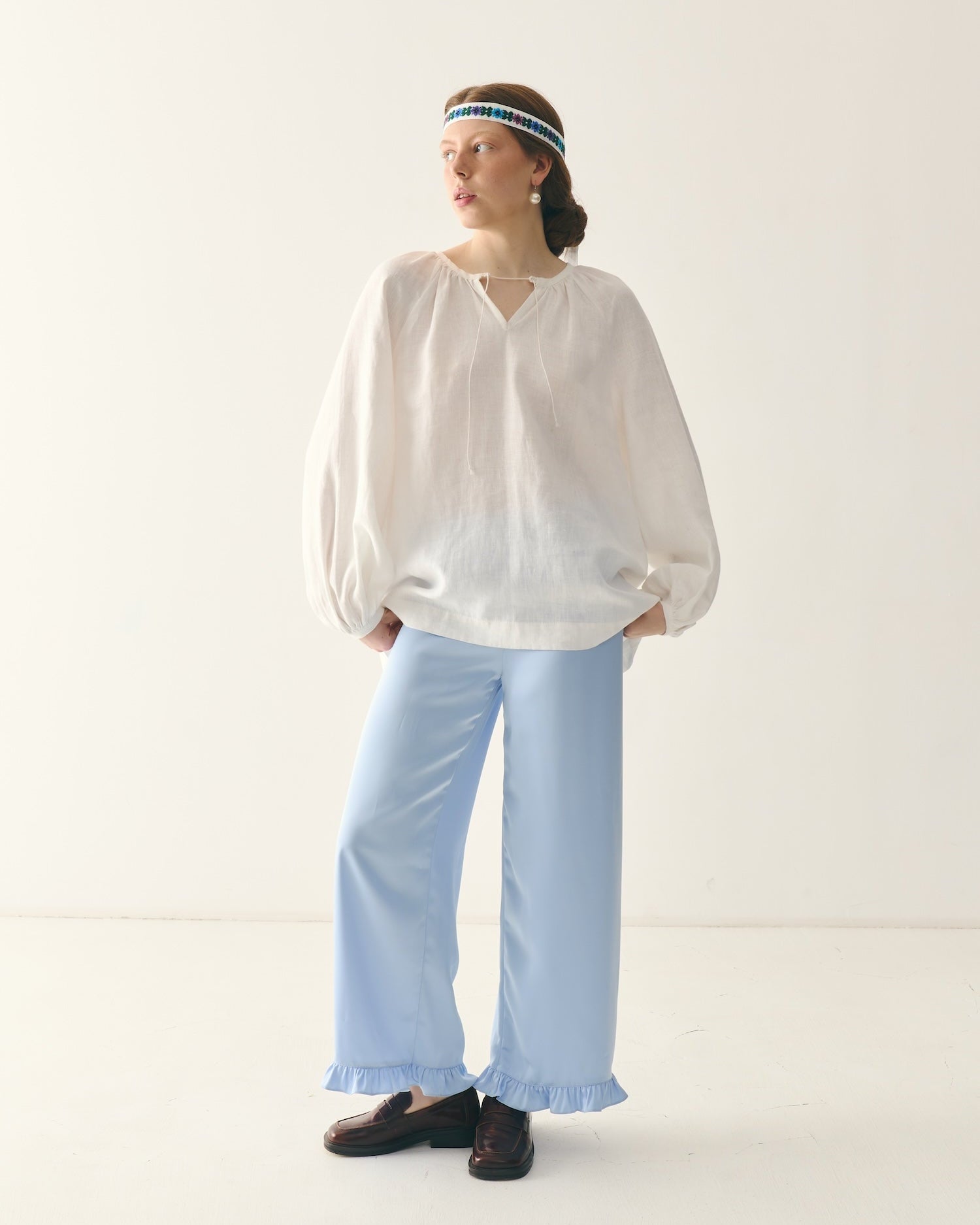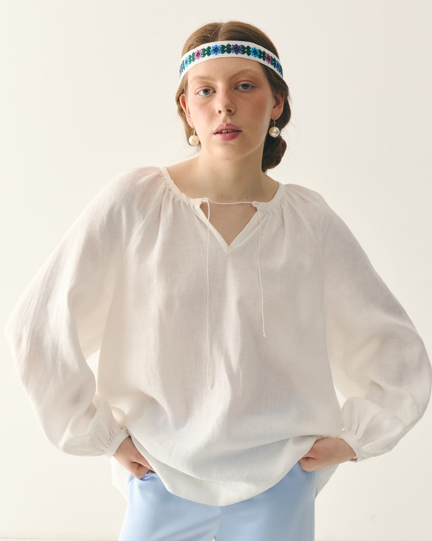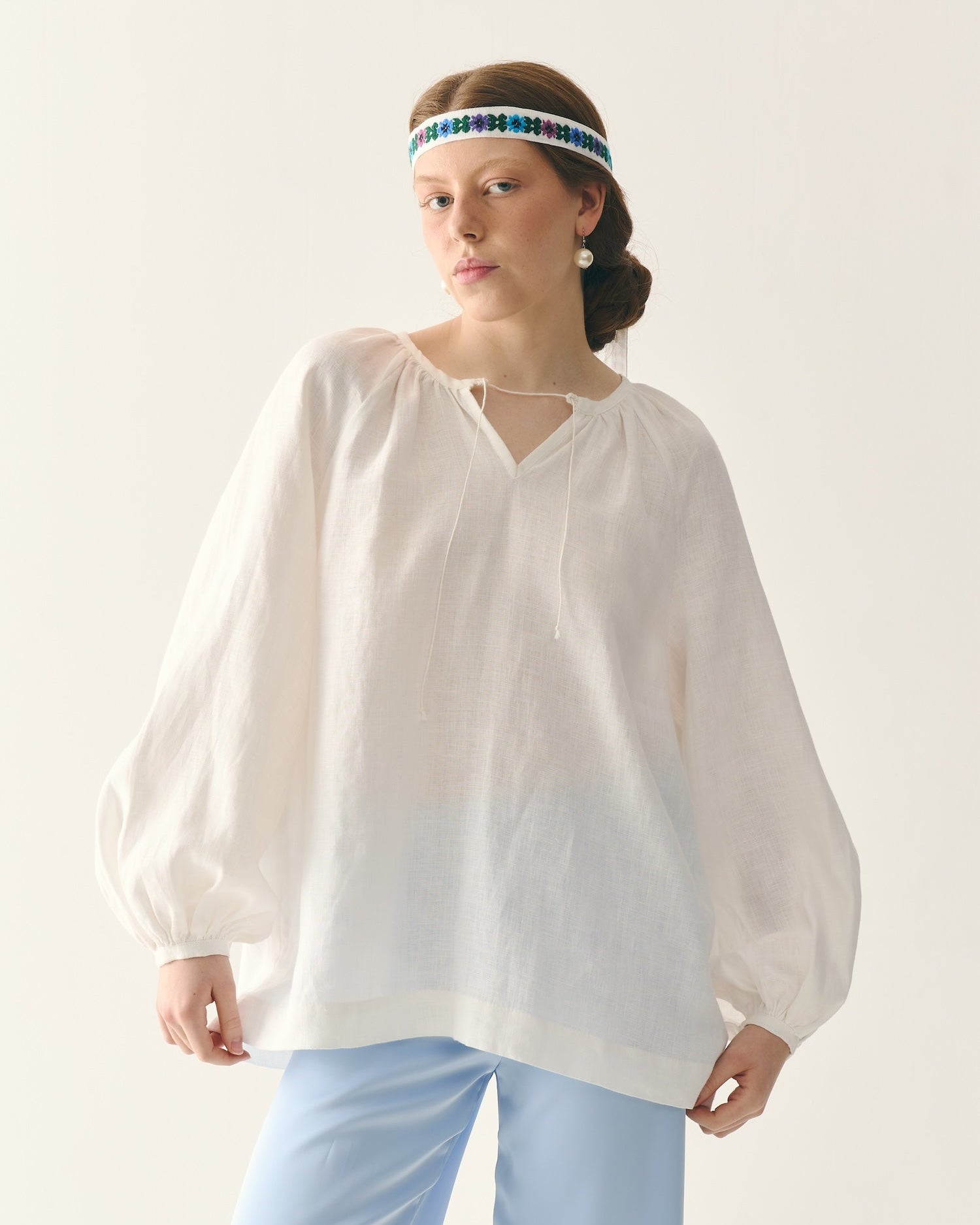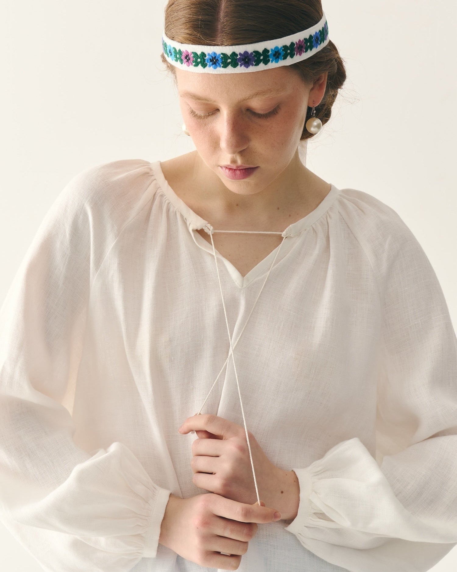 Створена згідно з давнім борщівським кроєм: широка в обʼємі, з пишними рукавами, зібрана у рясні складочки. На манжетах гудзички, біля горловини шнурівка. Петельки вивʼязані вручну з бавовняної нитки. У комплекті мішечок зі змінними кольоровими стрічками для горловини.