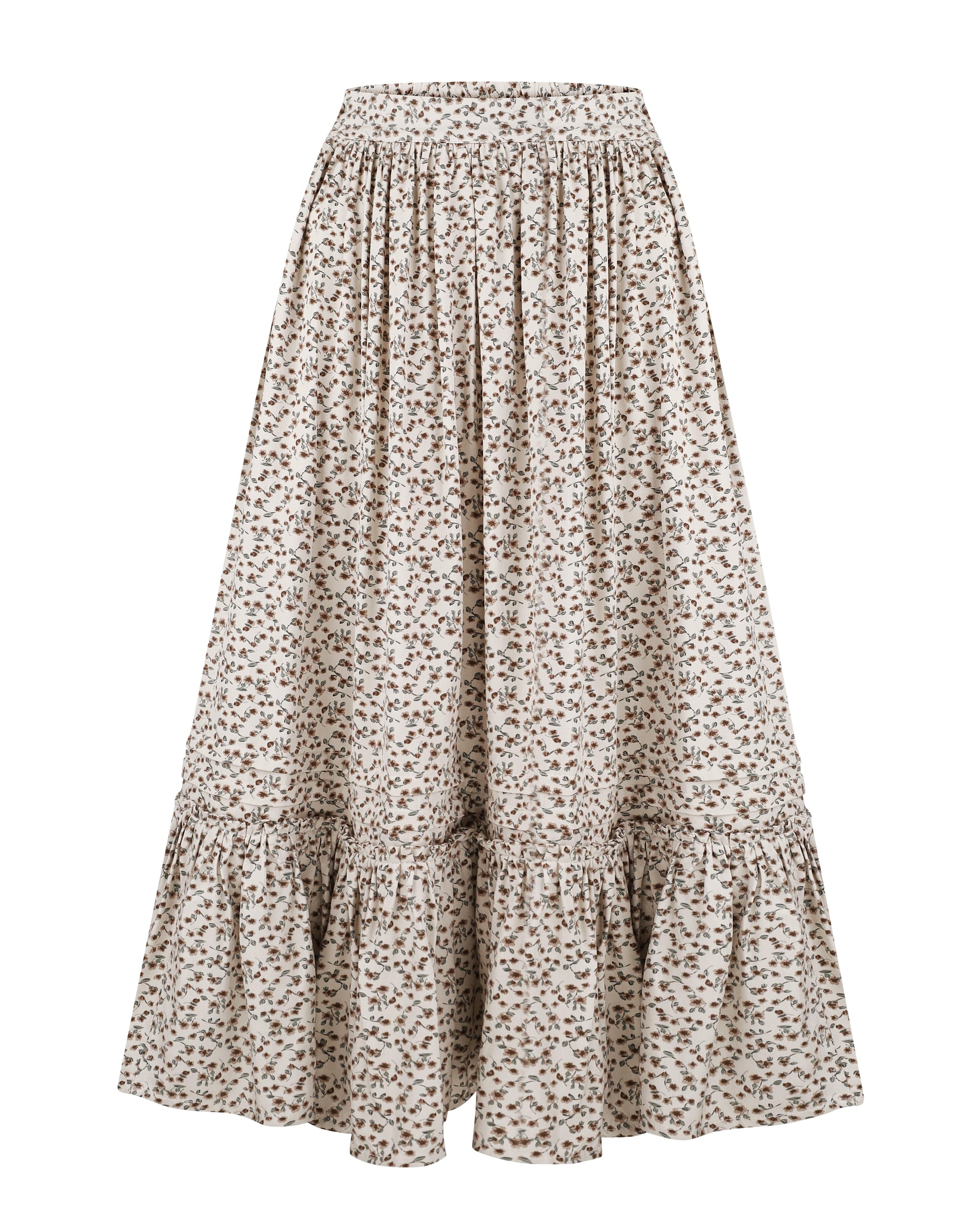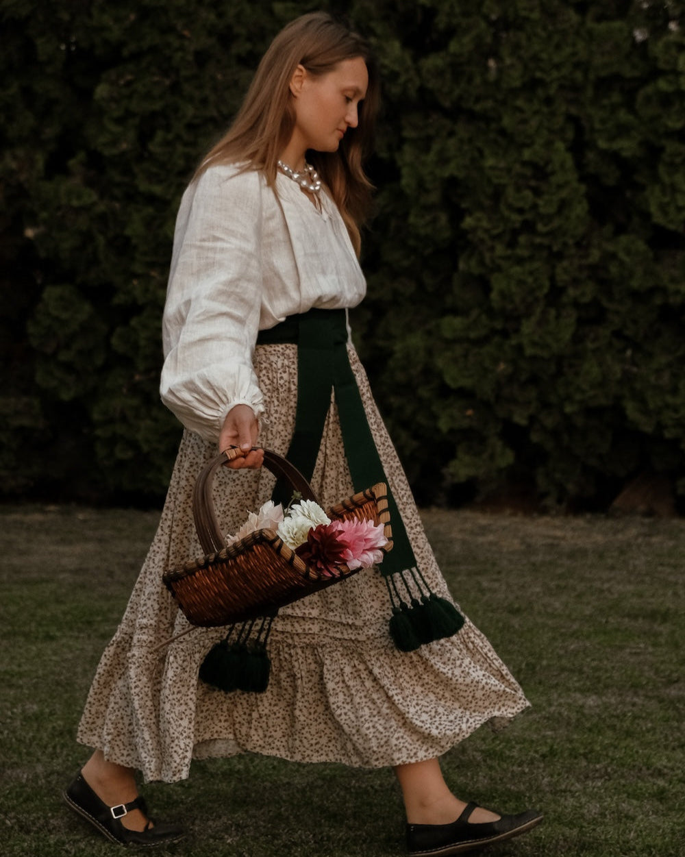 Спідниця "Хорольська" - створена для кружлянні у танці, адже шлярка по низу чарівно танцює в цей момент разом із Вами!) Тканина легка, приємна до тіла, рясно призібрана у поясі та гарно спадає до низу. Орнамент на тканині у вигляді дрібних квіточок молочного, бежевого, коричневого і хакі кольорів.
