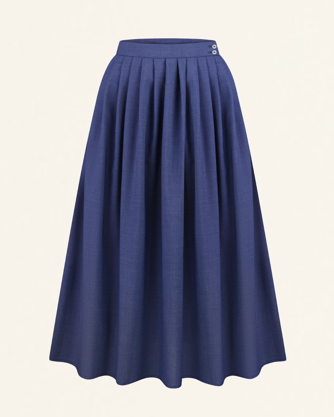 Спідниця з тонесенької синьої 100% вовни, що легко стане як повсякденним елементом, так і частиною святкового панського строю. Оздоблена у поясі рівномірними складками, регулюється двома рядами ґудзиків з натуральної мушлі. Повна довжина 85 см.