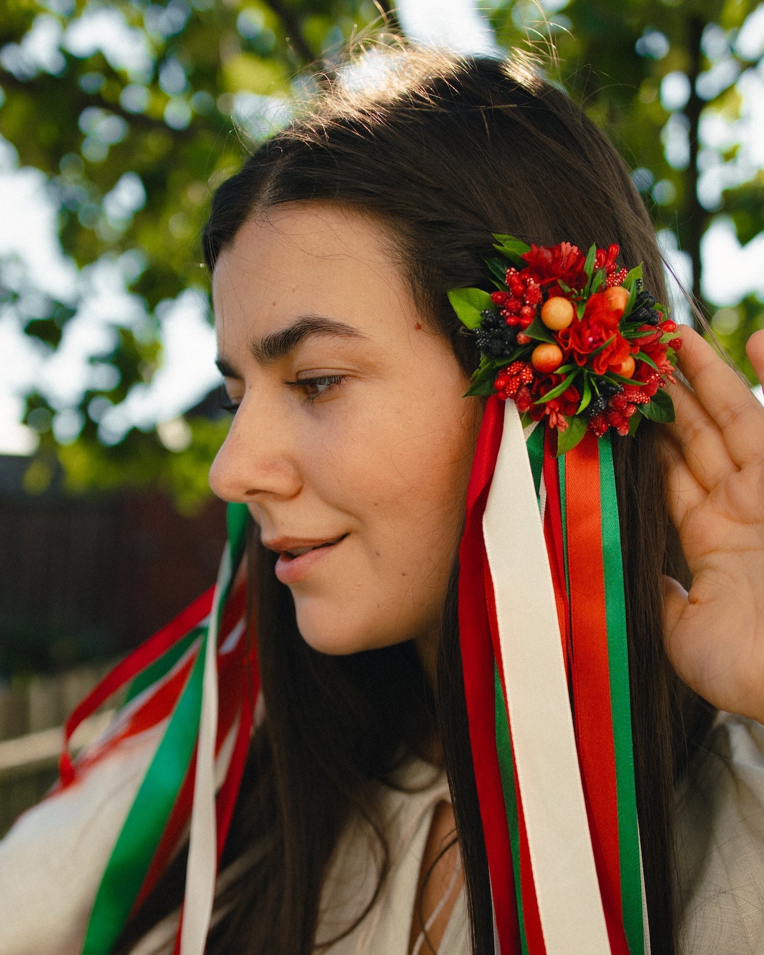 В основі металева заколочка, що легко чіпляється на косички, гульки чи просто на розпущене волосся. Зверху оздоблена штучними квітами і рясно атласними стрічками до низу.