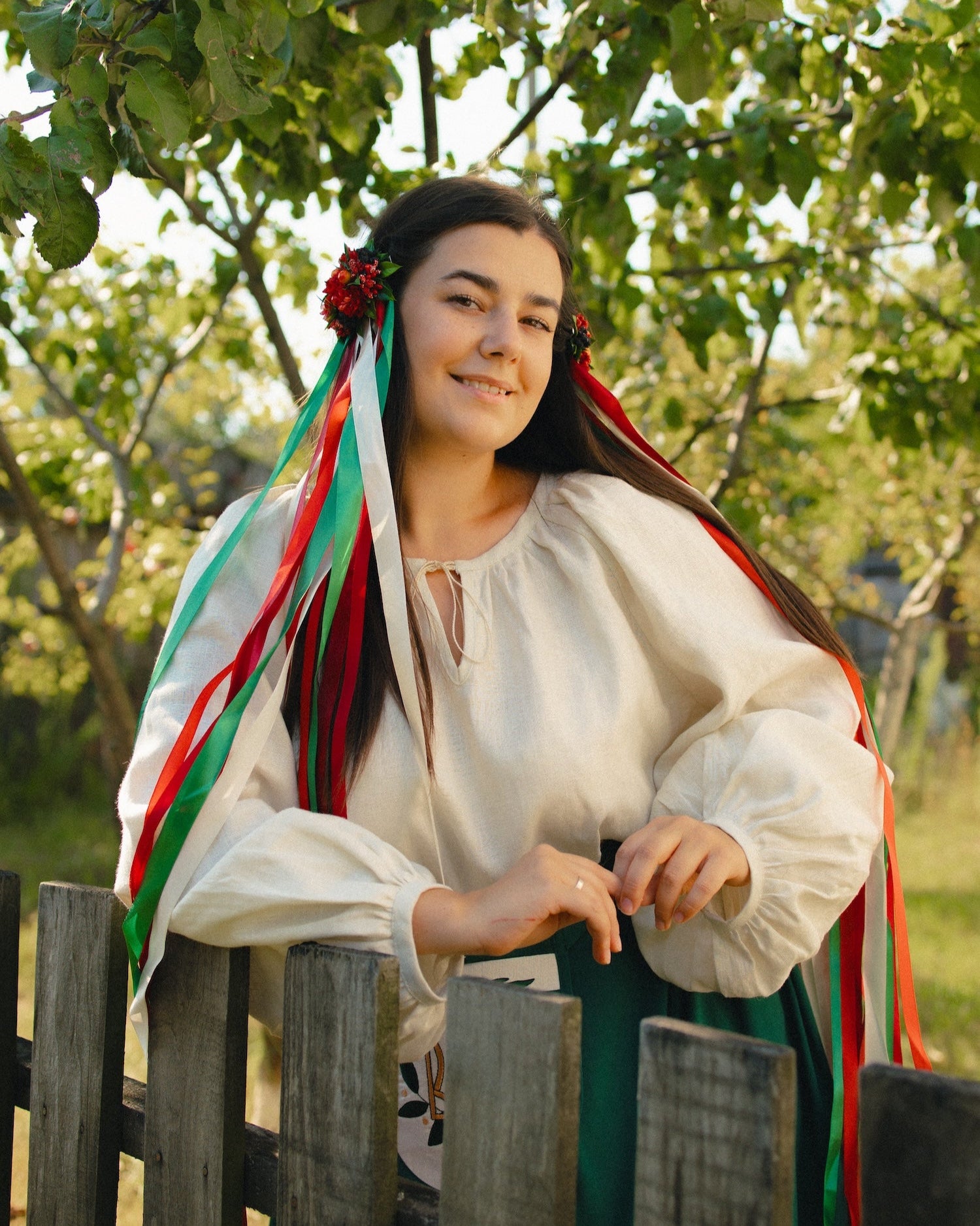 Прикраса "Дівча" - пара заколок зі стрічками, що додає образу святковості та яскравості. Стрічки чарівно розлітаються у різні боки при ходьбі чи кружлянні і особливо підкреслюють красу зачіски. Якщо хочеться додати до свого традиційного вбрання особливо-дівочий убір, то прикраса "Дівча" - чудовий варіант.