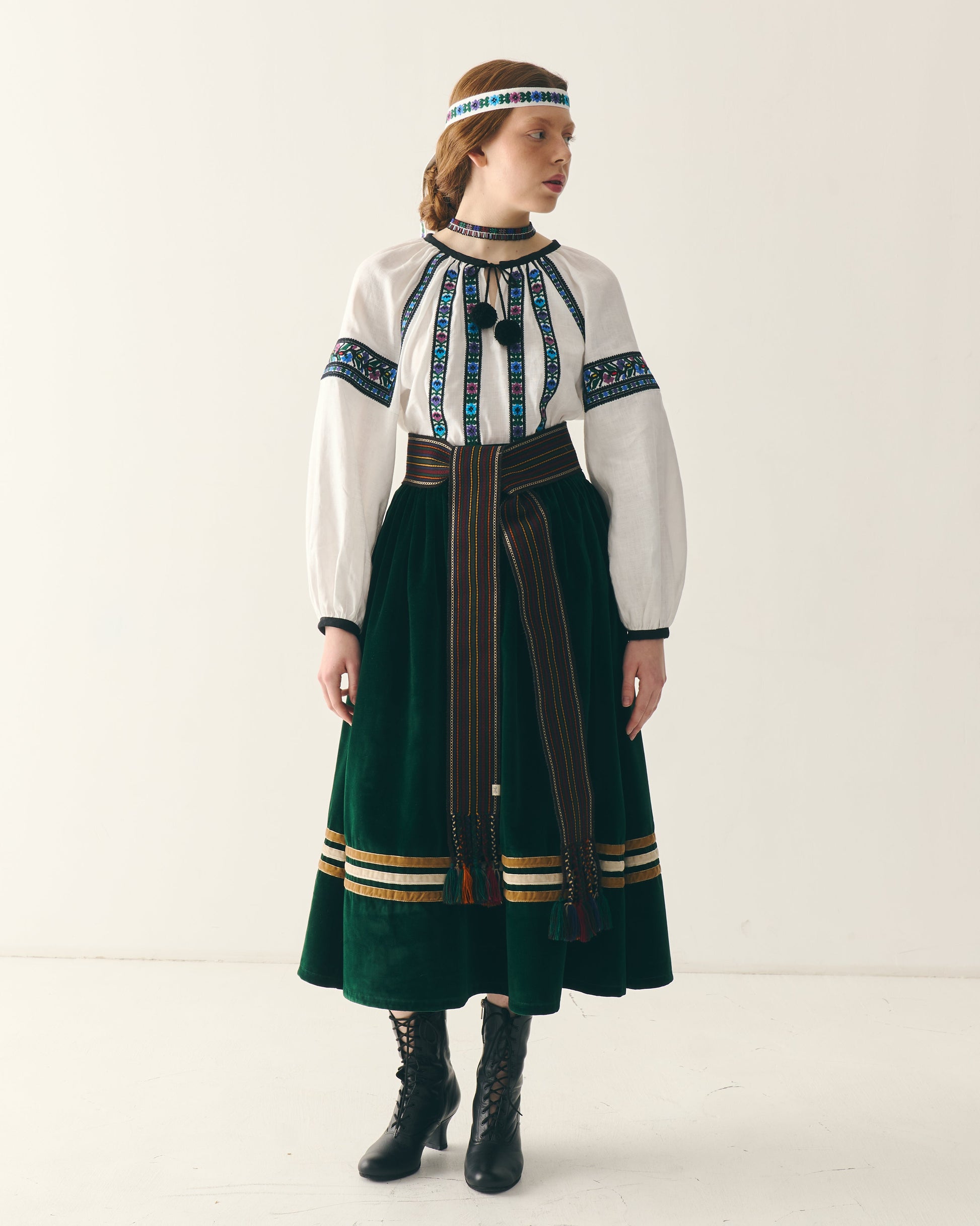 Кохта з оксамитом "Кодимська" / Сірий / 10% вовна, 24% віскоза, 64% ПЕ / XS-S - Сіра спідниця з вишитим поясом "Вінницька" / Сірий / M / 10% вовна, 24% віскоза, 64% ПЕ - Традиційна коротка сорочка "Кодимська" / Молочний / 30% льон, 70% віскоза / M-L - Нам