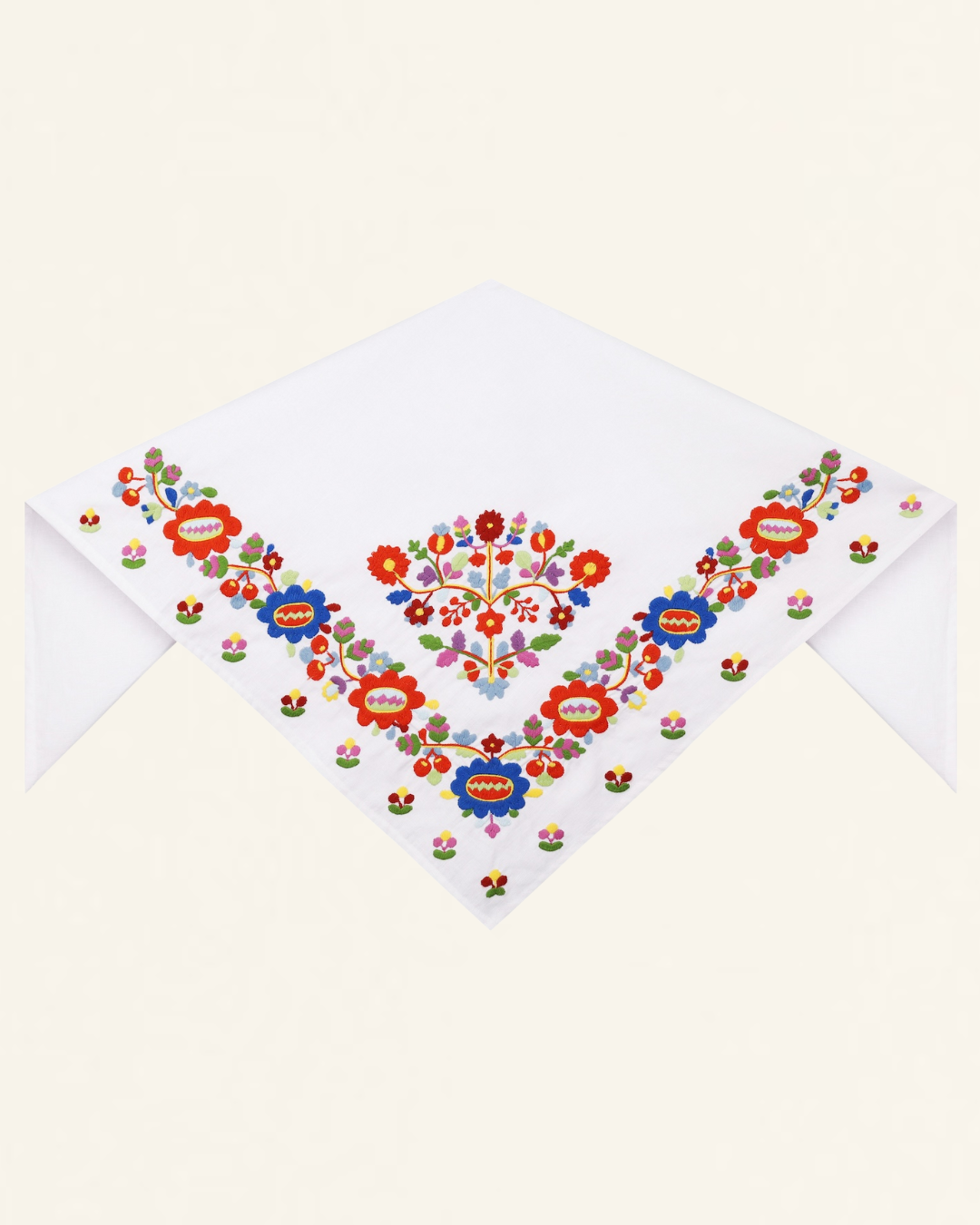 Вишита хустинка з колекції "Надсяння" - надзвичайно святкова та яскрава річ, яка оздоблена вовняною вишивкою із зображеннями квітів. Саме Яворівщина славиться таким особливим орнаментом, який неможливо сплутати із будь-яким іншим регіональним візерунком. Вишивка розташована з одного боку на куті, зворот охайний. Виріб білого кольору, у складі якого льон та бавовна.