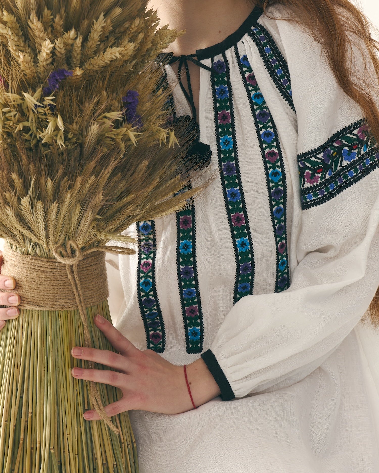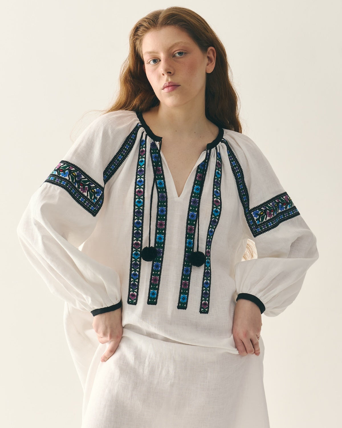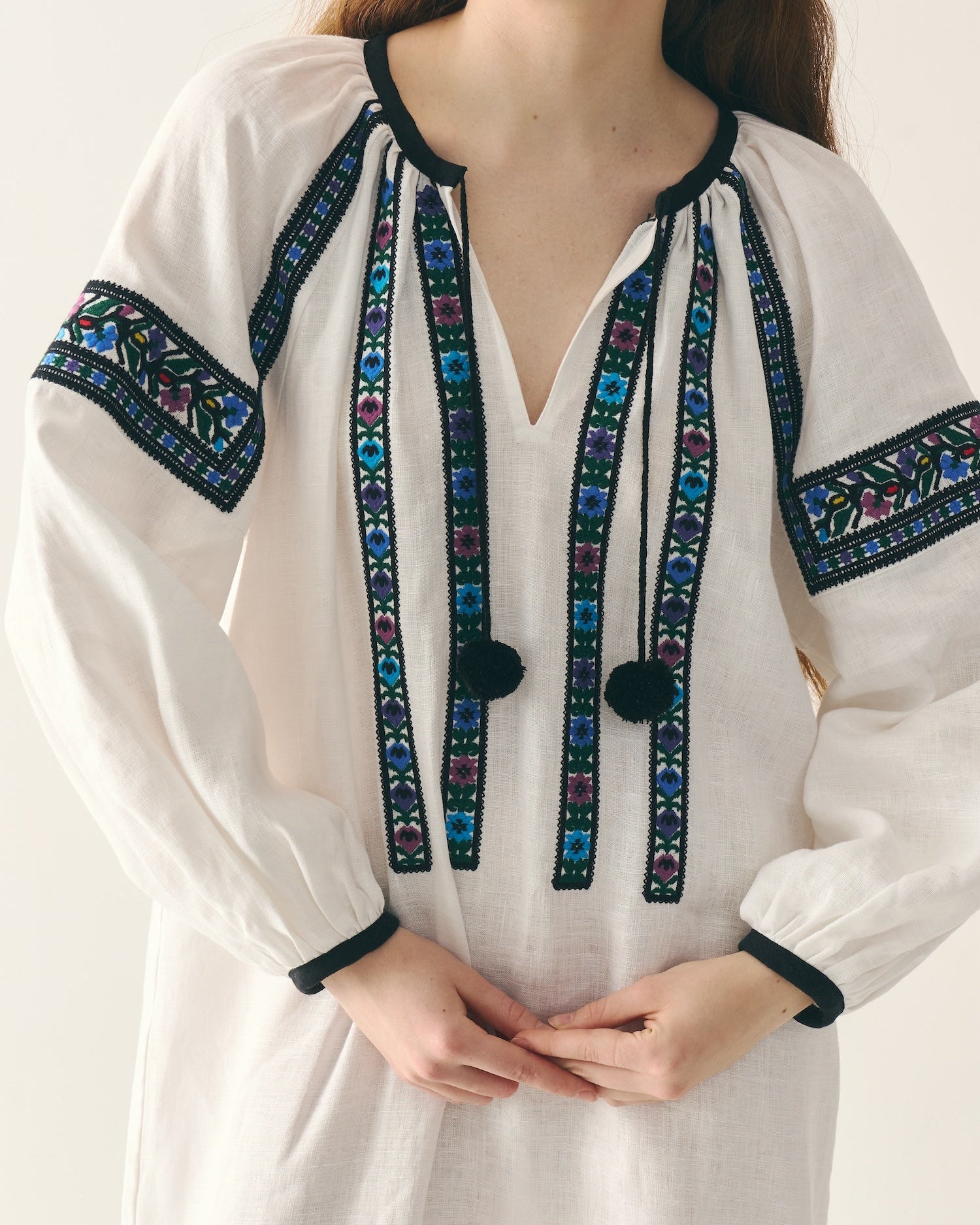 Витончена традиційна додільна борщівка з вишитим подолом. Довгий крій сорочки, що вишита вовною й орнаментована обʼємними смугами квітів і зірок спереду, по спинці та на уставках рукавів. Оздоблена двома чорними "балабонами" на косичках. Виготовлена з натурального 100% мʼякого льону. На манжетах ґудзики з натуральної мушлі.