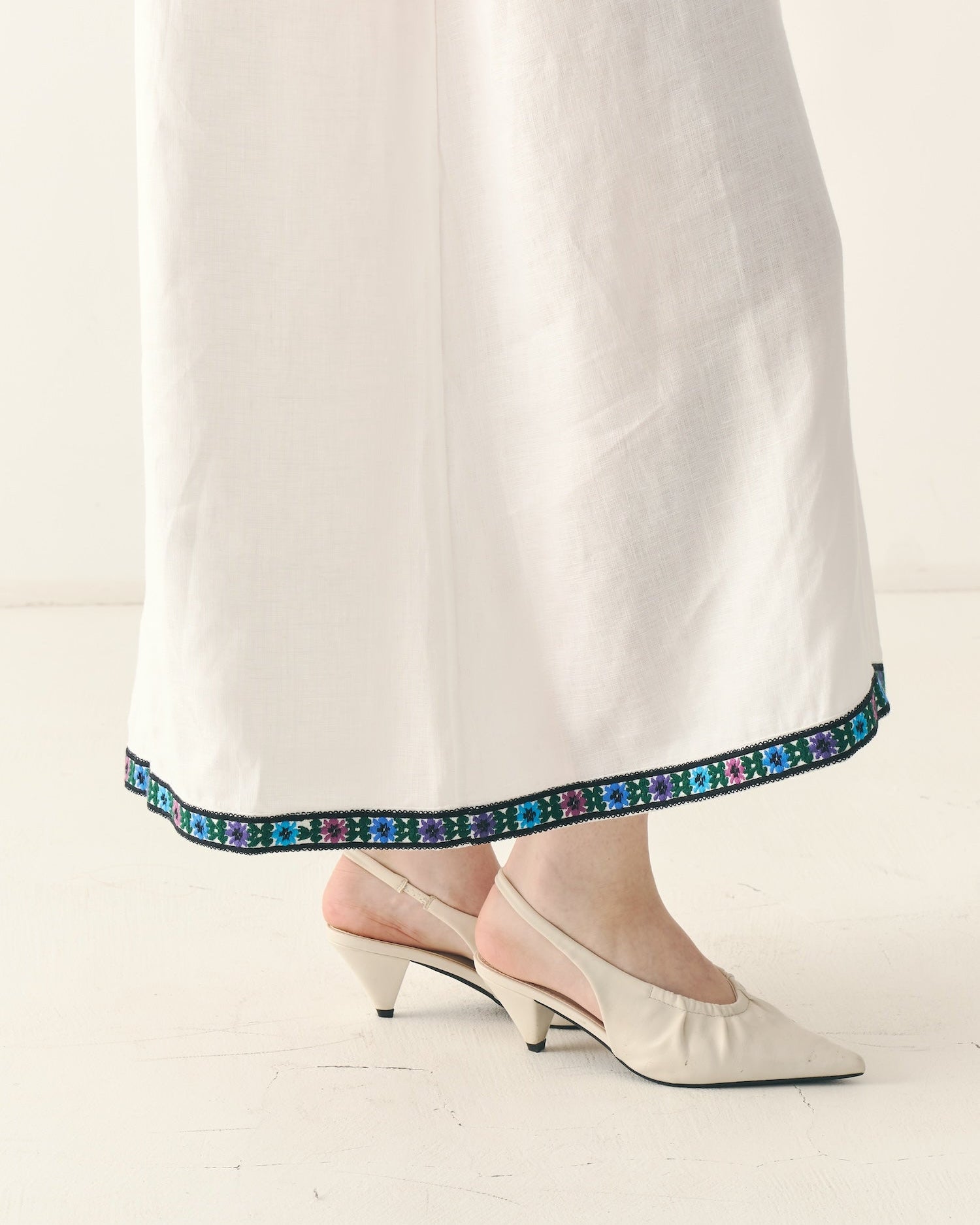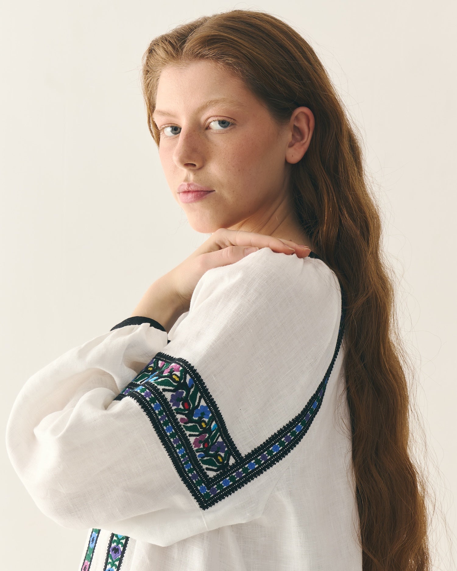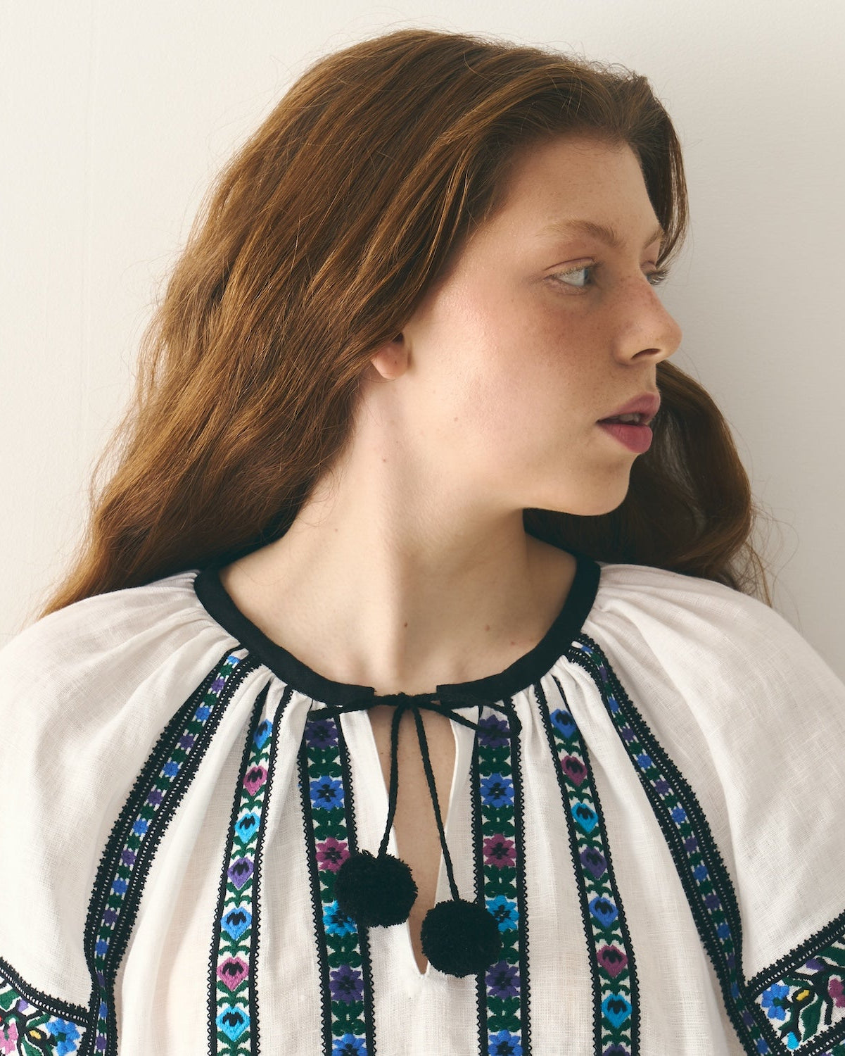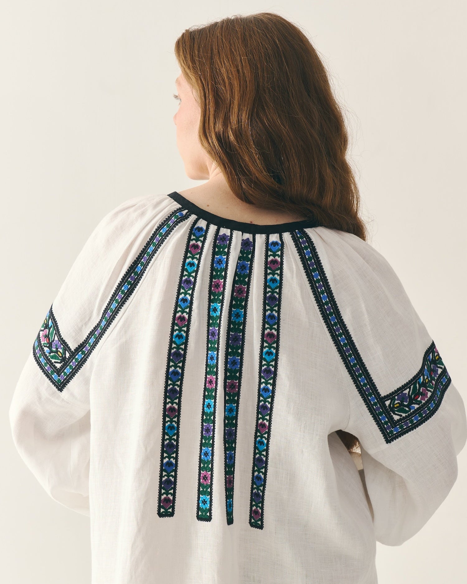 Витончена традиційна додільна борщівка з вишитим подолом. Довгий крій сорочки, що вишита вовною й орнаментована обʼємними смугами квітів і зірок спереду, по спинці та на уставках рукавів. Оздоблена двома чорними "балабонами" на косичках. Виготовлена з натурального 100% мʼякого льону. На манжетах ґудзики з натуральної мушлі.