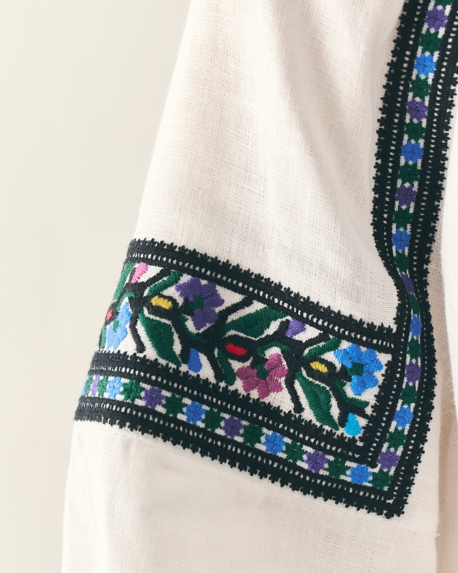 Вишивка вовною, надзвичайно обʼємна і наближена до справжньої ручної. У кольорах: чорний, блакитний, синій, рожевий, фіолетовий, вкраплення червоного і жовтого. Після першого прання вишивка стає мʼякесенькою.