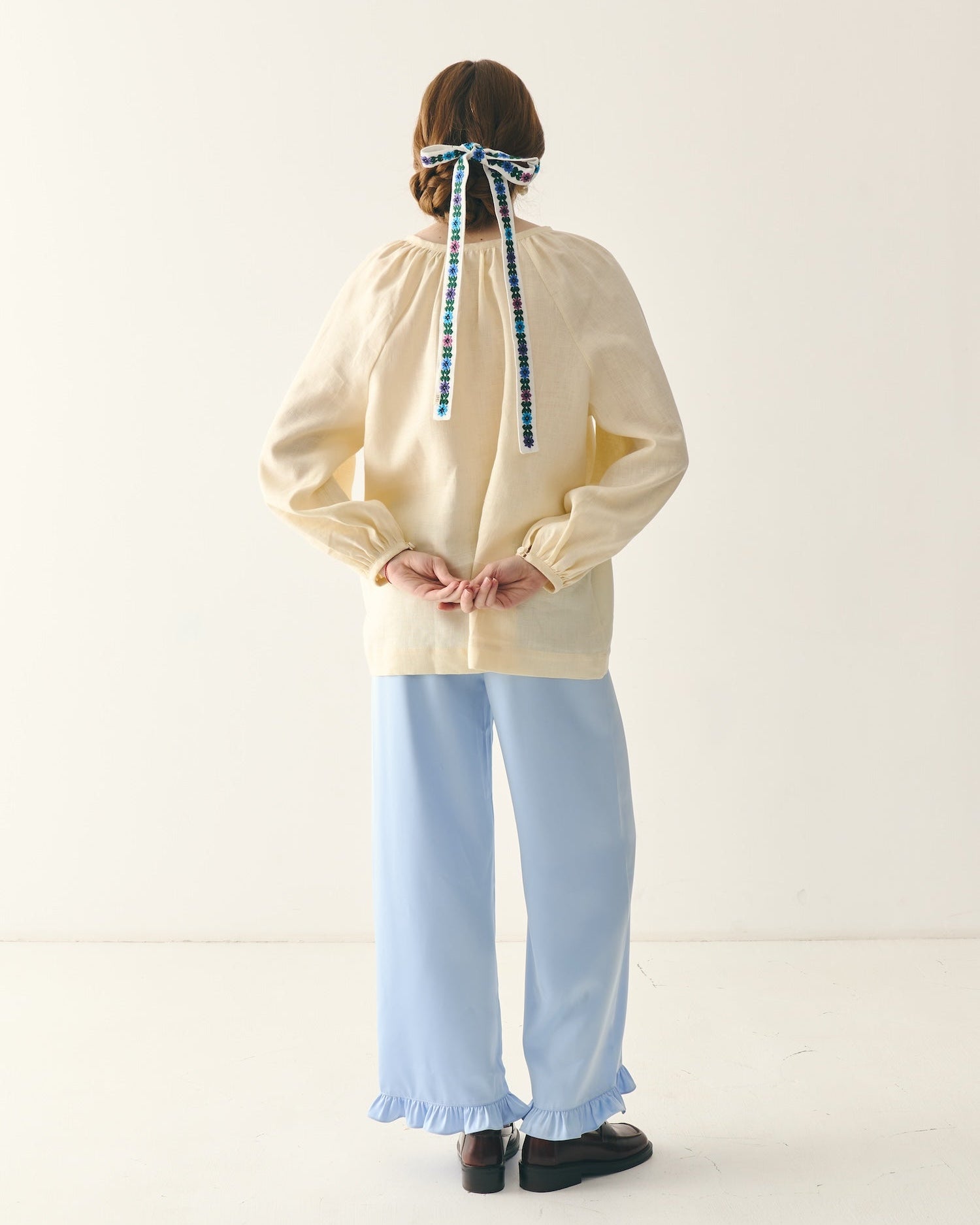 Святкова лляна стрічка вишита вовною - довершення традиційного образу та окраса мінімалістичного буденного. Орнамент обʼємний і виглядає наче справжній ручний, повторює вишиті квіти з борщівської сорочечки.